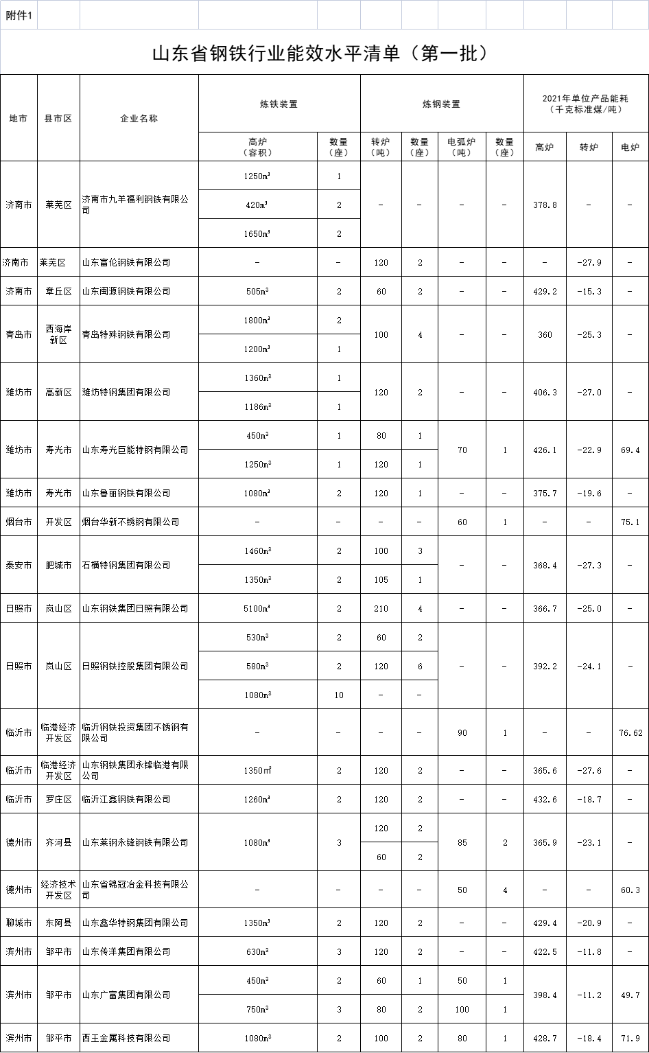山東鋼鐵行業(yè)能效水平(第一批)公告